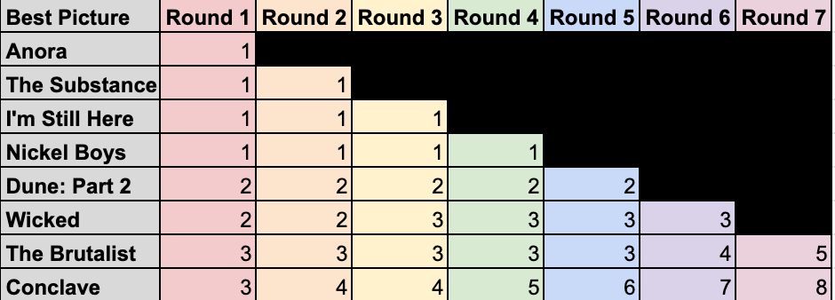 The final tally: Conclave won with 8 votes and The Brutalist came in second with 5 votes. Here are the results from each round: